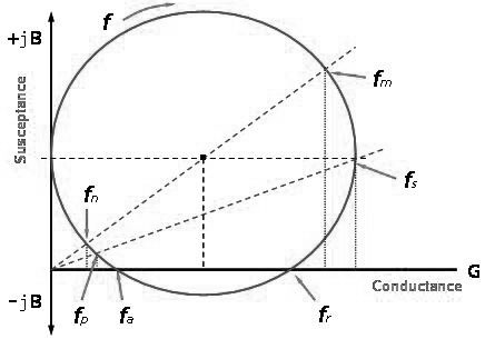 在技術文獻及產品應用上, 石英晶體共振子的共振有三組不同定義及特性的共振頻率. (1) 串聯諧振頻率及并聯諧振頻率 ( fs , fp ) (series resonance frequency and parallel resonance frequency) (2) 諧振頻率及反諧振頻率 ( fr , fa ) (resonance frequency and anti-resonance frequency) (3) 最大電導頻率及最小電導頻率 ( fm , fn ) (maximum admittance frequency minimum admittance frequency).這三組頻率的導納(admittance)圖, 可以從(圖)復數坐標清楚的看到.