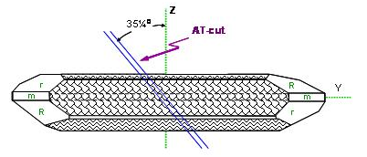 在各種不同種類的切割角度方式中, AT角度切割的石英芯片適用在數MHz到數佰MHz的頻率范圍,是石英芯片應用范圍最廣范及使用數量最多的一種切割應用方式. 在(圖五)中, 從石英晶棒X-軸向的上視圖, 可以看到對Z-軸向旋轉約35度的AT 方向. 這在大量生產的技術上也是很好達成的一種作業方式..jpg)
