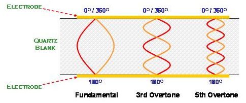 在AT切割角度的石英晶體共振子主要是以厚度剪切振蕩模態(tài)存在. 石英晶體在共振時(shí), 除了基本波振蕩之外, 高階的倍頻共振也與基本波振蕩同時(shí)存在于石英晶體的電極區(qū)域之間. 但是, 由于壓電材料的電極是電氣相位相反的振動(dòng)環(huán)境, 所以, 祇有奇數(shù)倍(odd number)的高頻倍頻可以發(fā)生, 偶數(shù)倍(even number)的倍頻共振在石英晶體共振子是不會(huì)存在的(圖).