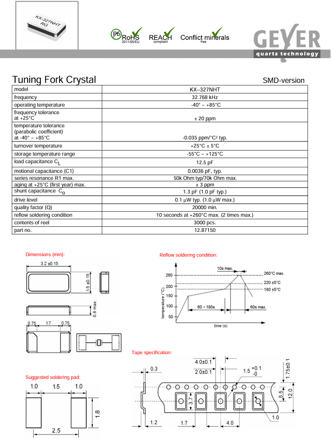 | 12.87159 | GEYER | CRYSTAL 32.7680kHz 12.5pF SMD | KX-327NHT | ±20ppm | -40°C ~ 85°C | 2 | 3215 | Geyer |