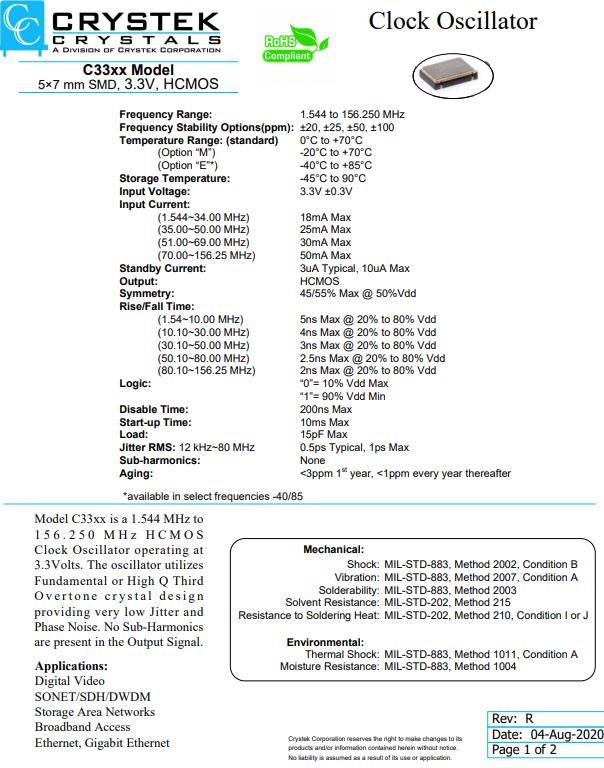 | C3390-20.000 | CRYSTEK晶振 | C33 | XO (Standard) | 20MHz | ±100ppm | 0°C ~ 70°C |