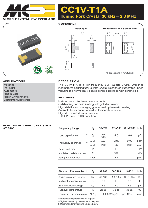 | CC1V-T1A-32.768kHz-12.5pF-30PPM-TA-QC | Micro Crystal | 晶體 32.768 kHz 12.5 pF +/-30 PPM -40/+85C | - 40 C | + 85 C |