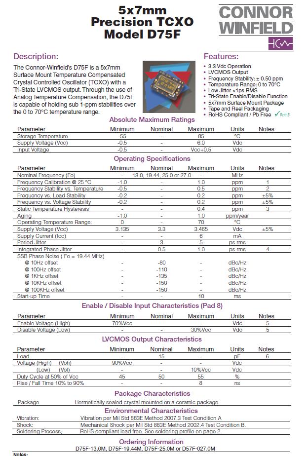 | D75F-025.0M | Connor-Winfield 進口TCXO晶振 | D75F | 25MHz | 0°C ~ 70°C |