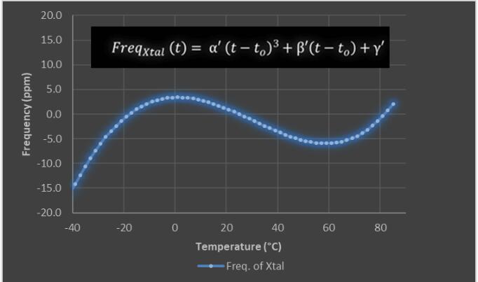 溫度和頻率偏差之間的關(guān)系可以進口晶振使用3次多項式函數(shù)進行近似計算.一個5th度函數(shù)也可用于更精確的曲線擬合.