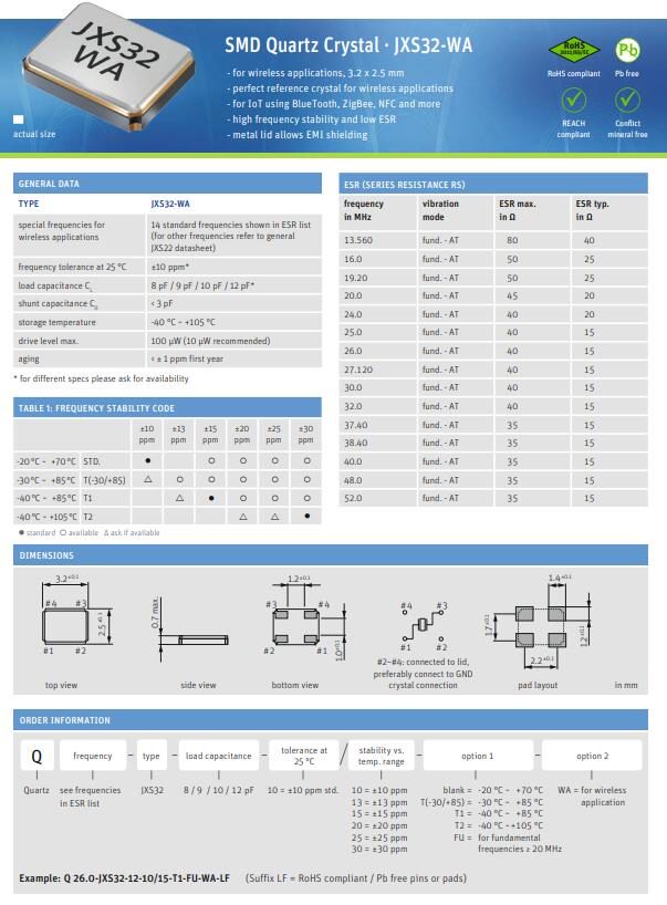 | Q 19.2-JXS32-12-10/10-WA-LF | Jauch Quartz | JXS32-WA | 19.2MHz | ±10ppm | 12pF | -20°C ~ 70°C | 4 | (3.20mm x 2.50mm) |