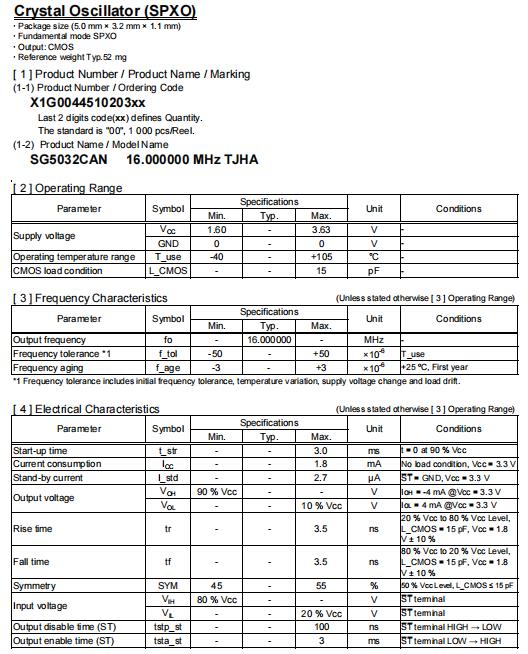 | X1G004451020300 | SG5032CAN | 16.000000 MHz | 5.00 x 3.20 x 1.10 mm | CMOS | 1.620 to 3.630 V | -40 to 105 °C | +/-50 ppm |