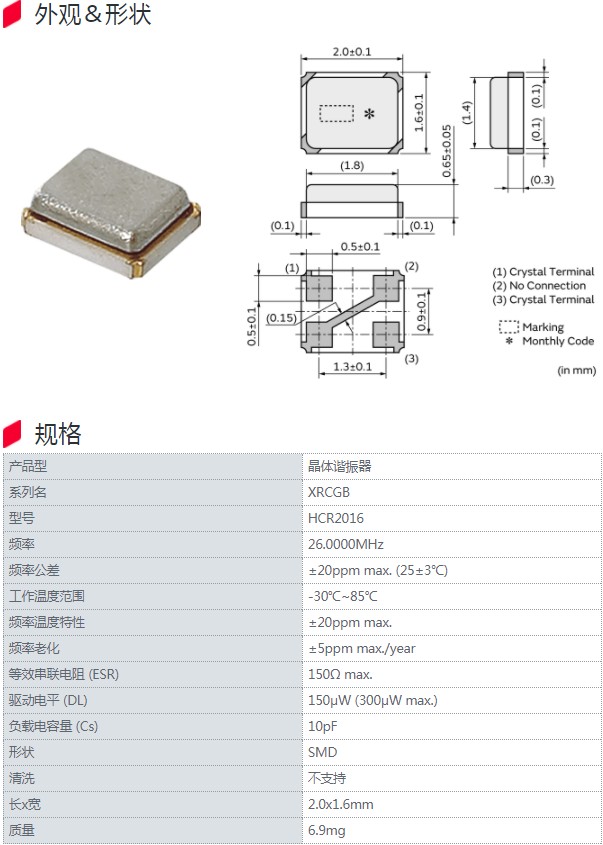| XRCGB26M000F3M02R0 | HCR2016 | 26.0000MHz | ±30ppm max. (25±3℃) | 消費級 |