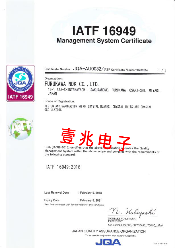 - [2019-07-01]日本NDK晶振IATF 16949汽車(chē)認(rèn)證...